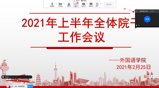 2月27日上午和下午,学院分别召开了党政联席会议和全体教职工大会,就新学期党建工作、教学工作、学生工作、科研工作、学科建设、分工会工作等进行了详细部署。刘祥清院长要求各科室精心组织,全体教师认真准备,注重教学纪律,确保不出教学事故、不出教管管理事故、不出学生伤害事故。党总支书记李亚林强调,今年是“十四五”的开局之年,也是建党一百周年,希望全体教职工同心同德、团结奋斗,谱写外院发展新篇章,以优异成绩为建党100周年献礼!