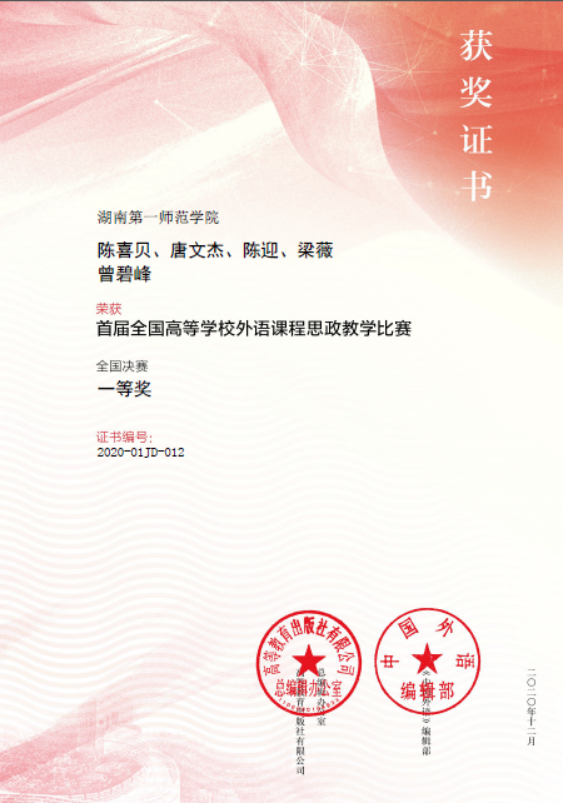 2020年以来学院每年选派教师参加湖南省外语课程思政比赛和全国课程思政案例征集与交流活动,连续4年荣获全国特等奖1项、全国一等奖2项、全国二等奖1项、全省一等奖2项、全省二等奖4项。