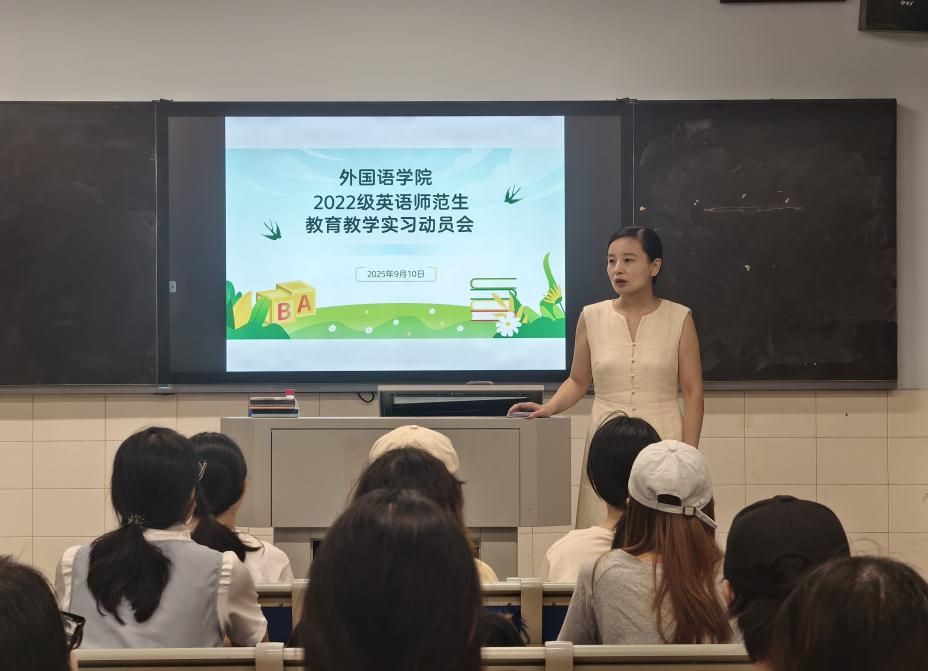 为切实保障师范生教育实习工作有序开展,萝莉岛 于9月10日在怀中北107召开了2022级英语专业非定向师范生的教育实习动员会。陈钰副院长、实习带队老师魏艳、徐丹、梁薇以及22级全体实习生参与了本次动员会。