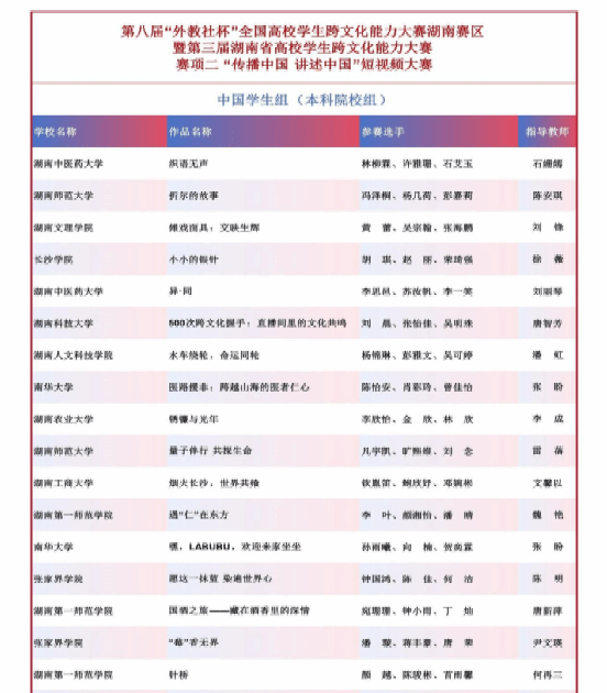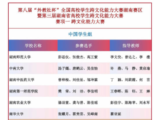 2025年11月8日至9日,第三届湖南省高校学生跨文化能力大赛在中南大学举行。本届大赛由湖南省教育厅主办,湖南师范大学与上海外语教育出版社协办,以“坚定文化自信,增进国际理解”为主题,共吸引全省41所本科院校和22所高职院校的634名选手参加,竞争激烈。