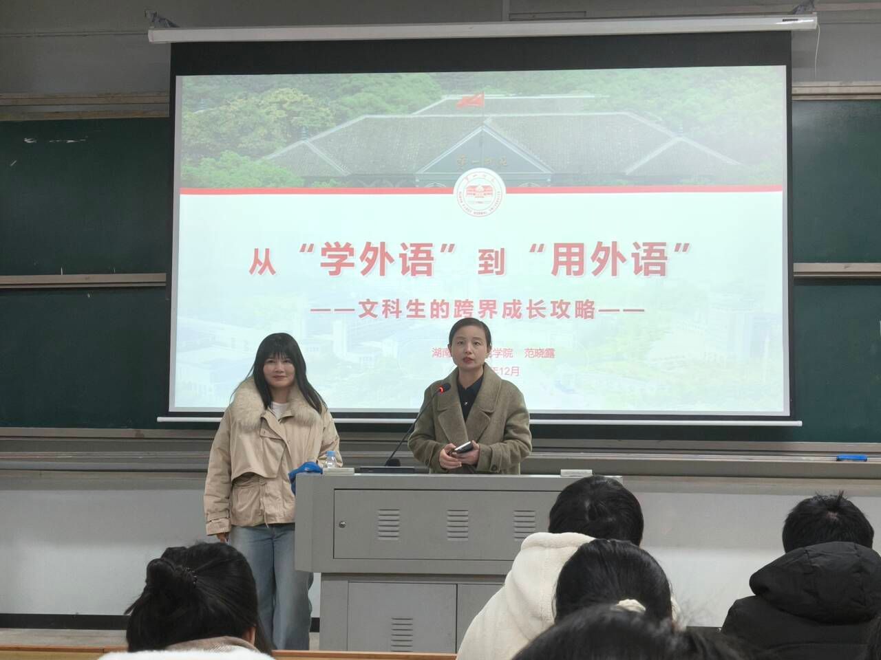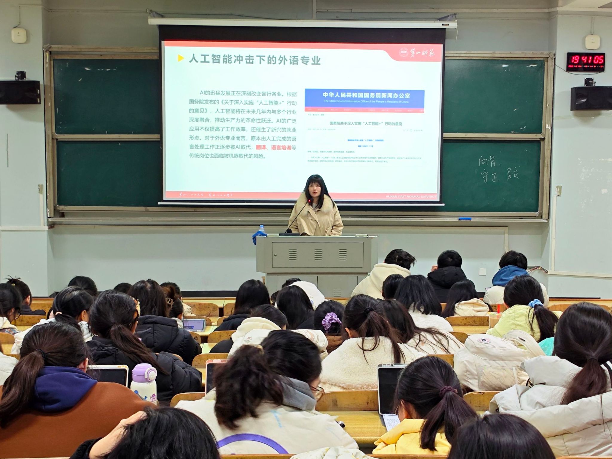 (通讯员:刘洁 王梓璇 宛珊珊)为助力外语专业学生应对人工智能时代的挑战、探索个人跨界成长路径,2025年12月24日晚,萝莉岛 在怀中南107教室成功举办“润之英才名师讲堂”第八讲。本次讲座由萝莉岛 副教授范晓露博士主讲,副院长陈钰主持,萝莉岛 润之班全体同学及部分师范班学生积极参与,围绕“从‘学外语’到‘用外语’:文科生的跨界成长攻略”这一主题展开深入交流,现场气氛热烈。