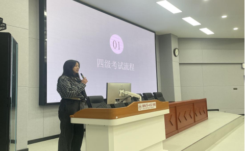 刘妍伶同学首先为大家带来了四级的整体考试流程,并分享了“三步走”的答题技巧——“浏览,划记,猜测”。她以真题实践的方式重点强调了听力部分,提倡同学们在备考过程中需养成良好做题习惯,并注重知识的灵活运用。谢佳慧同学则重点分享了阅读理解的攻略,深入讲解了“词性成分判断法”在阅读理解中的重要性。同时,她还针对日常积累部分提供了词汇积累、信息筛选能力的培养等宝贵建议。刘洁同学为大家带来了写作技巧,重点分析了“现象解释型,问题解决型,观点选择型”议论文。通过讲解翻译真题,她将自身学习过程中所遇到的问题与采用的学习方法倾囊相授,引得同学们的热烈反响。