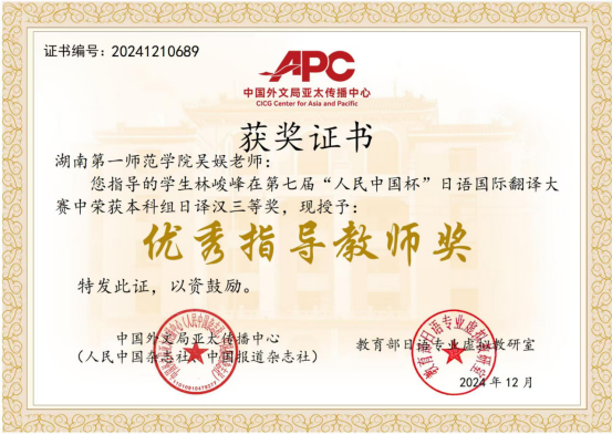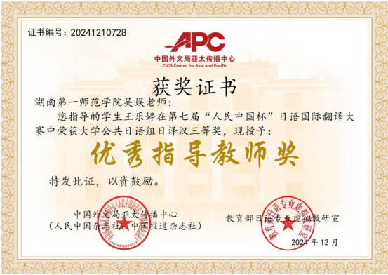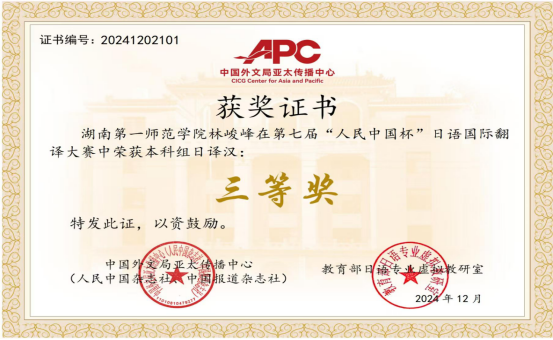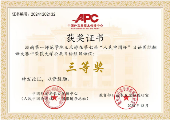 第七届“人民中国杯”国际日语翻译大赛近日落幕,萝莉岛 文学与新闻传播学院2024级汉语言文学专业1班林峻峰荣获全国大学本科日语组三等奖、萝莉岛 2022级英语专业4班王乐婷荣获全国大学公共日语组三等奖。萝莉岛 22级英语4班吴玉依凡、吴媛获得公共日语组日译中优秀奖,杨澜获得公共日语组中译日优秀奖,商学院24级国际经济与贸易2班陈逸仪获得本科日语专业组日译中优秀奖。指导教师吴娱获得优秀指导老师奖。本次比赛吸引了天津外国语大学、四川外国语大学、西安外国语大学、广东外语外贸大学、厦门大学、武汉大学、湖南大学、华中师范大学、首都师范大学等多所高校师生和企事业单位选手参赛。