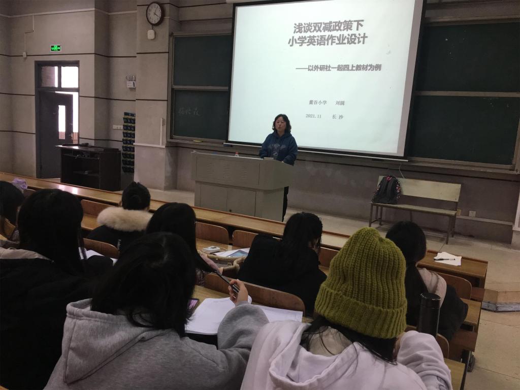 一师一附小董玲老师12月6号晚上6:30-9:30在实验剧场做了题为《核心素养背景下的小学英语单元整体教学设计》的专题讲座;博才梅溪湖小学汤英老师12月7号下午2:30-5:30在怀中南209做了题为《立足文本解读,提升课堂质效》的专题讲座;岳麓实验小学邓星老师12月11号上午8:30-11:30在怀中南209做了题为《跟着绘本去阅读》的专题讲座;麓谷小学刘圆老师12月15号下午2:30-5:30在怀中南209做了题为《浅谈双减政策下小学英语作业设计》的专题讲座。