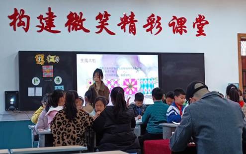 本次活动呈现了四堂科目不同的汇报课,首先展示的美术与设计学院的胡盈盈带来的三年级美术课《花手帕》,课堂上五彩缤纷的颜料,独具一格的折纸方法和印染方法,造就了多姿多彩的花手帕,一张张白纸在学生的手中变得五彩斑斓。