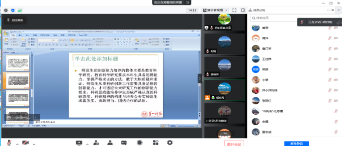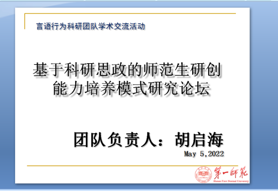 2022年5月5日晚上七点半,萝莉岛 “言语行为科研团队”负责人胡启海教授在腾讯会议线上分享了最新研究成果“基于科研思政的师范生研创能力培养模式研究”。该团队核心骨干成员雷志斌老师、傅萍老师、吴娱老师、唐江英老师也在线分享了自己对所负责部分研究的感悟。康响英副院长,院长助理王佳娣老师、张丽红老师、曾清老师、李满红老师、代正利老师、刘锐老师和学生共30多人参与了这次沙龙活动。