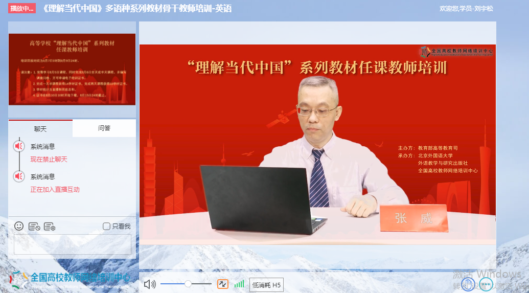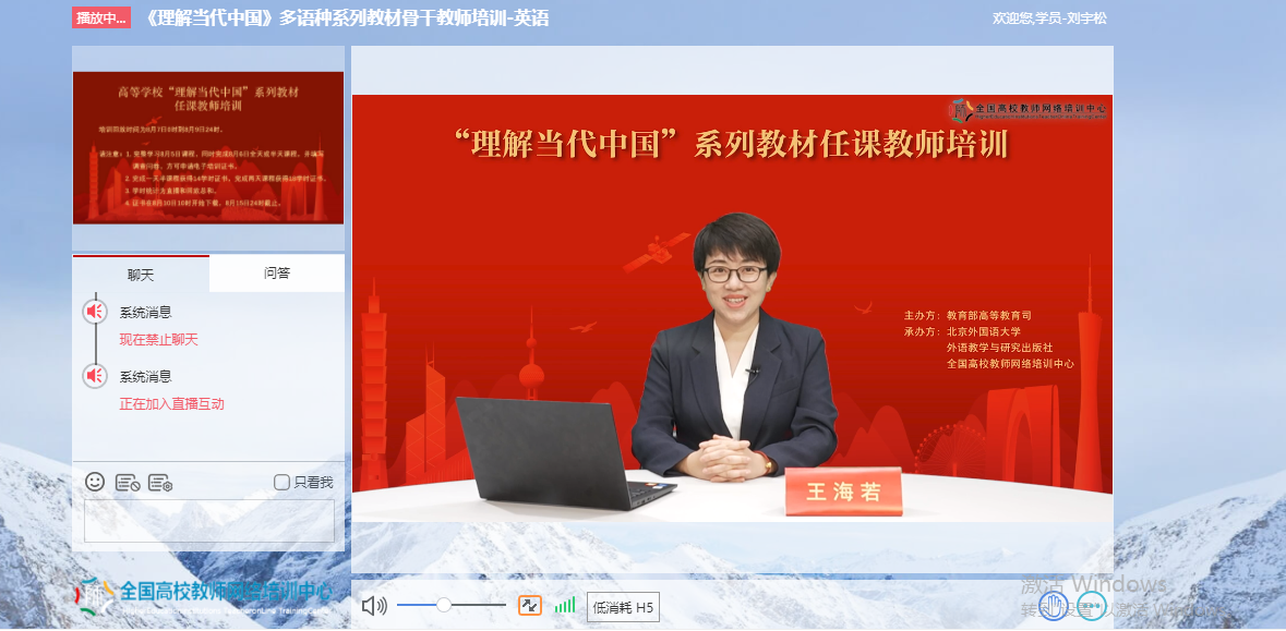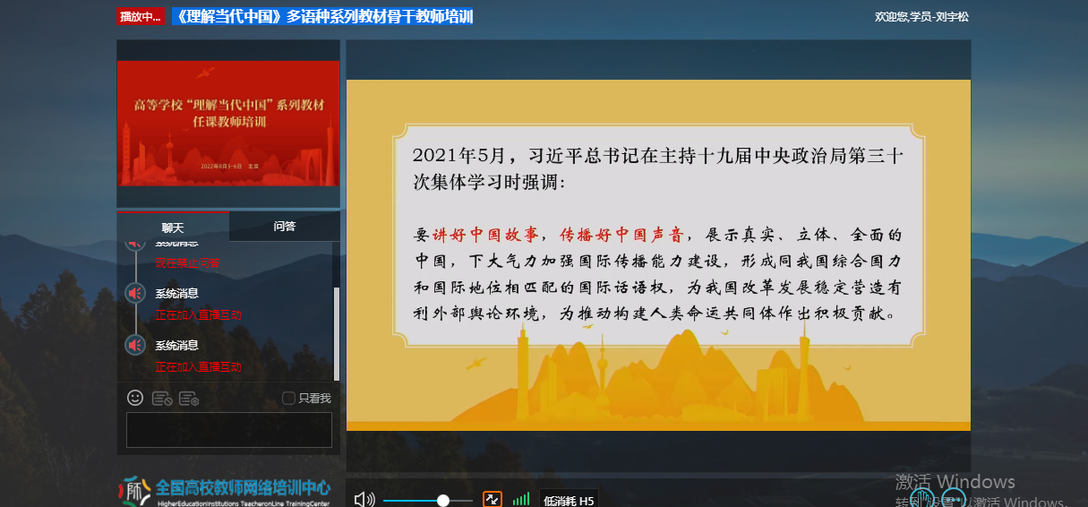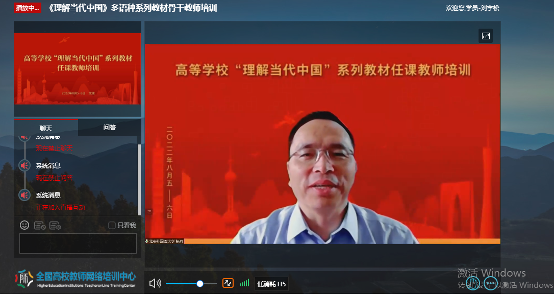 为深入贯彻《习近平谈治国理政》多语种版本进高校进教材进课堂(以下简称“三进”)工作精神,2022年8月5日至6日,萝莉岛 全体院领导、专业负责人、系(教研室)主任、读写组、翻译课程组、二外课程组、综合英语课程组课程负责人及成员20余人参加了由教育部高等教育司组织、北京外国语大学、外语教学与研究出版社、全国高校教师网络培训中心共同承办的“理解当代中国”多语种系列教材任课教师线上培训。
