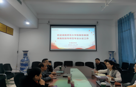 2022年11月19日下午,湖南师范大学陈敏哲教授应邀来萝莉岛 指导师范类专业认证工作。院党委书记刘祥清,副院长(主持工作)陈圣白,副院长唐文杰、康响英,院党委副书记禹晗,英语系主任张昀霓,以及自评报告撰写组八位老师参会。陈圣白主持会议。