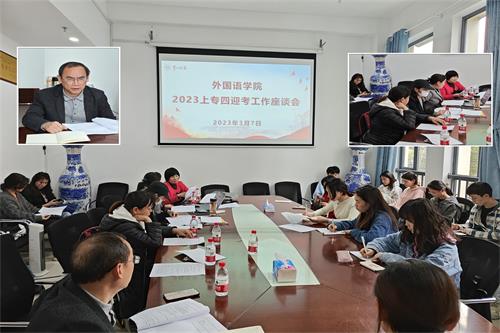 唐文杰提出2023年专四考试工作目标,并建议采取组织模考、开设专题讲座、举行经验交流会等系列措施来提升学生的专四成绩。唐文杰强调,我们应以英语专业四级迎考工作为抓手,认真落实学校“两性一度”课程建设,加强学风、教风建设,扎实推进课堂教学改革,助力“品质一师”建设。
