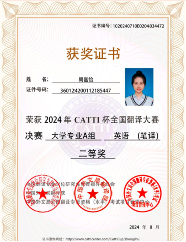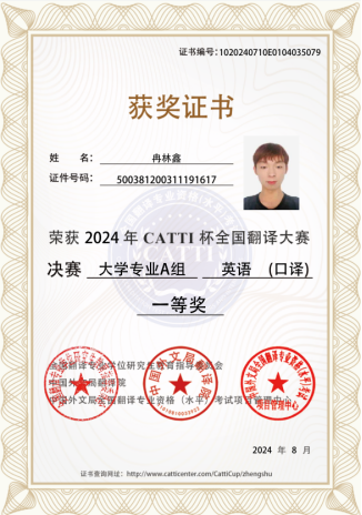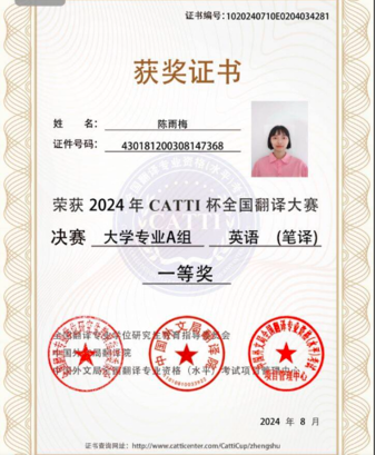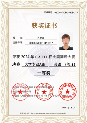 2024年8月,由全国翻译专业学位研究生教育指导委员会和中国外文局翻译院联合主办的2024年“CATTI杯”全国翻译大赛全国总决赛圆满落幕。萝莉岛 学生在本次比赛中表现优异,取得了三个一等奖,三个二等奖,两个三等奖的好成绩。冉林鑫、陈雨梅同学获得笔译赛项一等奖,冉林鑫获得口译赛项一等奖,周嘉怡、王乐婷、侯佳源获得笔译赛项二等奖,韩非宏、刘诗颖获得笔译赛项三等奖。