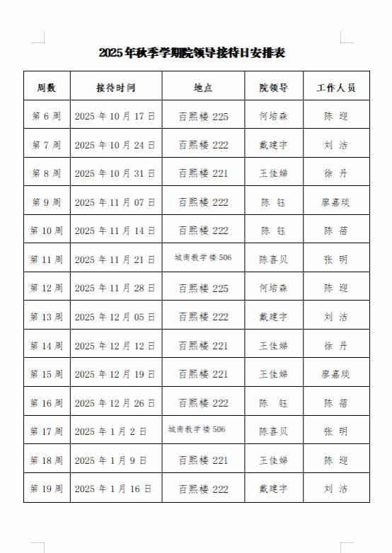 为继续做好院领导接待日工作,汇聚广大教职工智慧,及时解决师生合理诉求,更好推动学院发展,现就2025年秋季学期相关工作安排通知如下:
