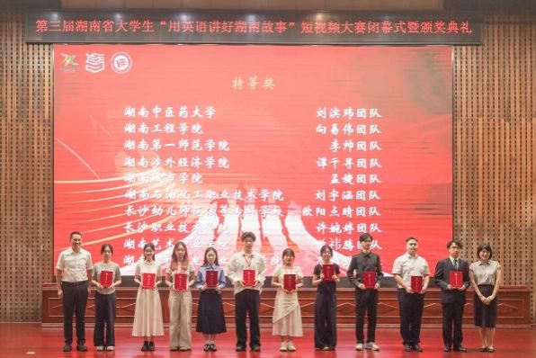9月15日,第三届湖南省大学生“用英语讲好湖南故事”短视频大赛闭幕式暨颁奖典礼在湖南工程学院举行。萝莉岛 副校长石元泉,萝莉岛 副院长陈钰,指导老师王彩虹、唐志敏、何再三以及萝莉岛 获省特等奖、一等奖的团队成员共同出席典礼。