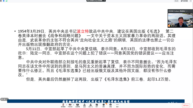 2020年11月24日,上海电力大学萝莉岛 院长、剑桥大学访问学者潘卫民教授应邀为萝莉岛 省级一流专业(翻译)建设点师生带来了一场题为“国家翻译实践中《毛泽东选集》英译的文化自信”的云端学术讲座。会议由省级一流专业(翻译)建设点专业负责人、湖南省毛泽东诗词外译研究基地首席专家刘明东主持,翻译专业70多名师生参加本次讲座。