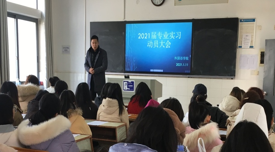 为进一步完善毕业生实习工作,引导学生做好实习心理准备,2021年1月11日,萝莉岛 17英语6班、17翻译班全体学生在怀中楼北307教室召开了2021届专业实习动员大会。会议由教科办教师廖爱秀主持,萝莉岛 副院长刘宇松、党总支副书记杨虎智、辅导员张明、实习带队指导教师陈钰、谭双顺、李森林以及17级非师范班学生共八十余人参加了此次会议。