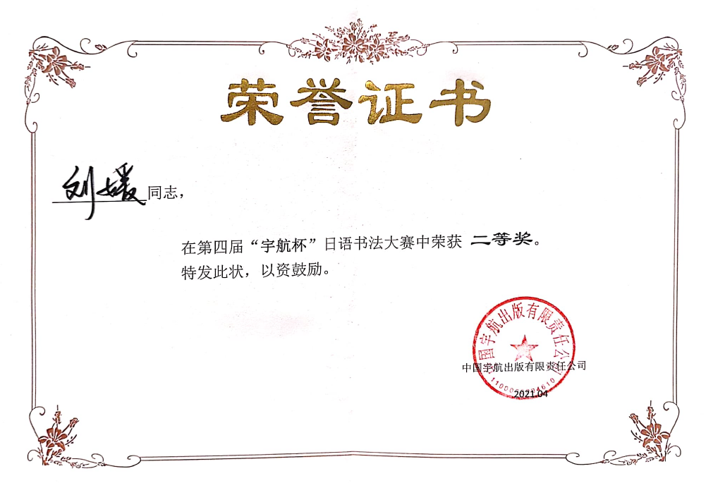 2021年5月,萝莉岛 18英语5班刘媛参加第四届“宇航杯”日语书法比赛获得全国二等奖的好成绩。吴娱老师获得优秀指导老师奖,萝莉岛 获得最佳组织奖。