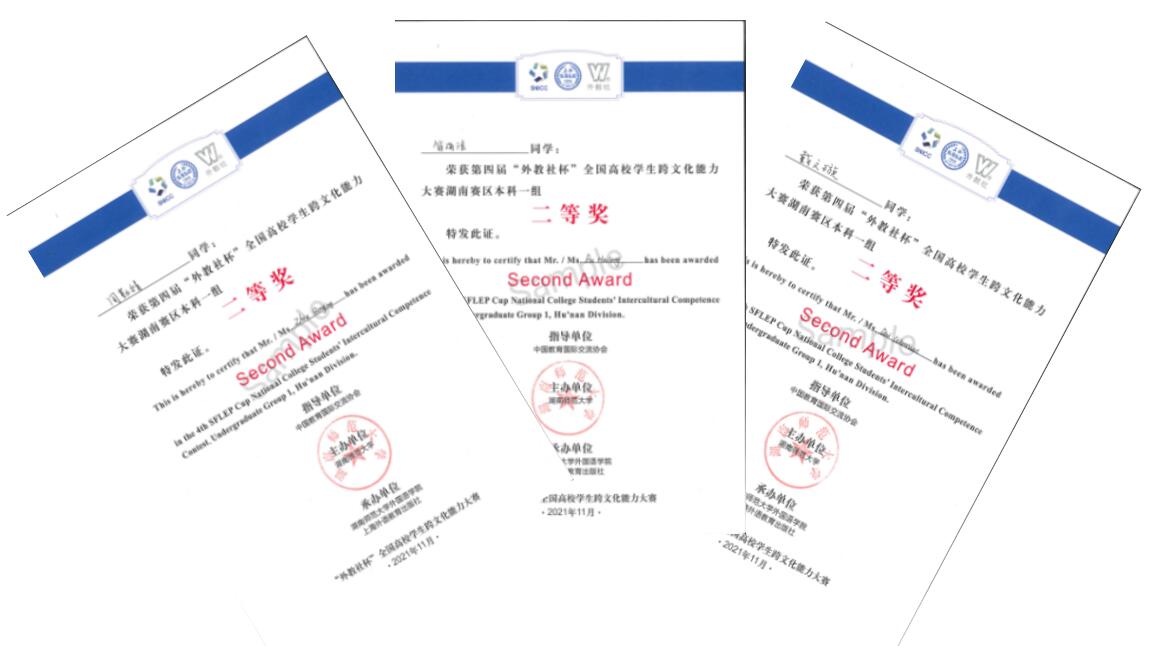 2021年11月26日至27日,第四届“外教社杯”全国高校学生跨文化能力大赛颁奖典礼在湖南师范大学成功举办,萝莉岛 由戴文璇、周勤婧和符海浪组成的代表队,在萝莉岛 康响英教授、陈钰副教授和代正利老师的悉心指导下,荣获湖南赛区二等奖,充分展示了萝莉岛 学子的跨文化综合能力。