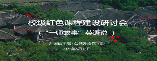 为适应新时代教育要求,落实“立德树人”根本任务,推动校级红色课程建设,萝莉岛 /公共外语教学部“‘一师故事’英语说”教学团队于2022年6月16日在百熙楼223室进行了红色课程建设专题研讨。研讨活动邀请教务处副处长唐文杰和外院教学副院长刘宇松莅临指导,“‘一师故事’英语说”教学团队全体成员参加。研讨活动由陈喜贝主持。