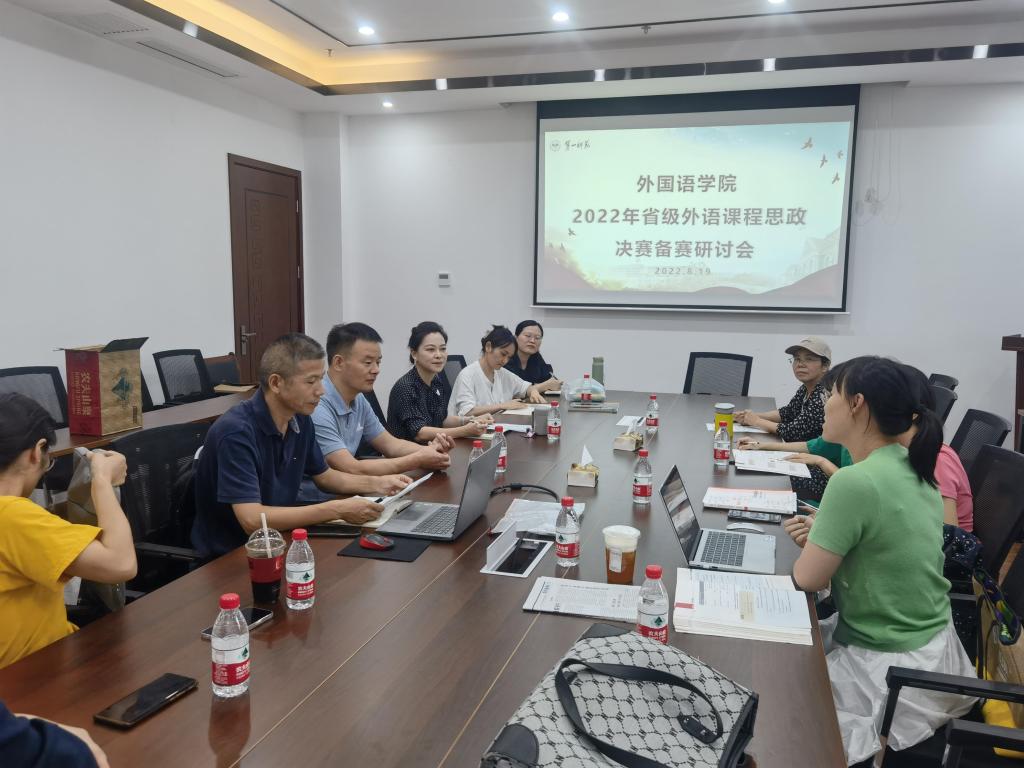 为更好地迎接9月中旬湖南省普通高校课程思政教学竞赛决赛,8月19日下午萝莉岛 在百熙楼214召开了外语课程思政省级决赛备赛研讨会。学院领导陈圣白副院长(主持工作)、刘宇松副院长、王彩虹参赛团队成员、雷琬瑢参赛团队成员及团队专家顾问李双、陈喜贝老师参加会议。教务处副处长汤希玮应邀指导研讨会。刘宇松副院长主持研讨会。