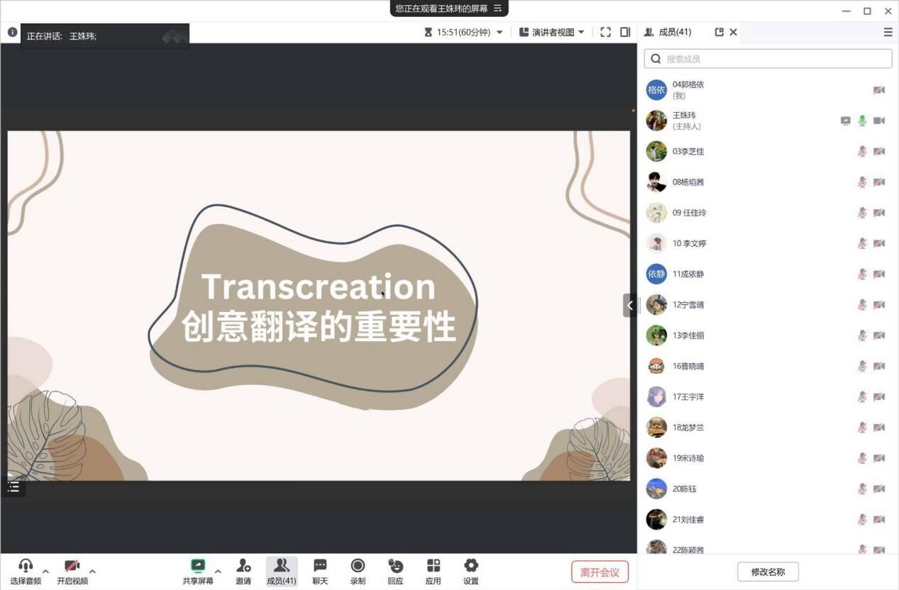 萝莉岛 于10月18日晚19:00-20:30在怀中北306教室举办了“Transcreation:创意翻译的重要性”专题讲座。本次讲座的主讲人为王姝玮老师,萝莉岛 23英语润之英才班全体学生参与了此次讲座。