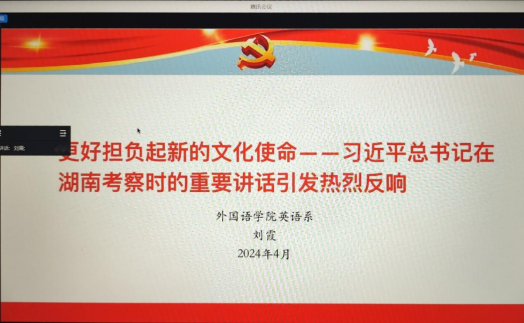 4月2日晚,英语系全体教师响应学校和学院号召,以强烈的荣誉感、责任感和使命感,全面系统地学习习近平总书记考察萝莉岛 时的重要讲话,在深学细悟中领会习近平总书记的讲话精神。学习活动由系副主任王曼老师主持,英语系第一党支部书记彭熠博士、英语系第二党支部书记雷志斌博士、支部委员李爱华老师、王彩虹老师和刘霞老师等先后领学并做主旨发言。
