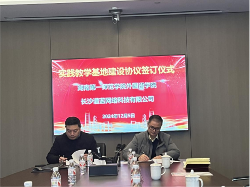 为进一步深化校企合作、规范实践教学管理,提高应用型英语人才培养质量,12月5日,萝莉岛 与长沙谱蓝网络科技有限公司签订共建合作协议并举行“实践教学基地”签约仪式。萝莉岛 党委书记何培森、副院长陈艳君、谱蓝科技人事经理李斌出席了仪式。