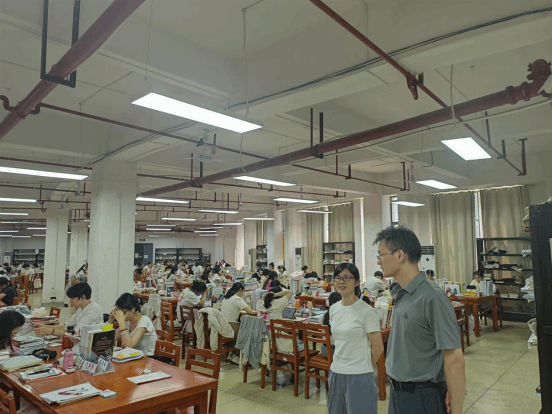 7月7日上午,学院党委副书记戴建宇、副院长王佳娣及辅导员一行深入图书馆102自习室,检查萝莉岛 考研学生自习情况,并开展备考督导工作。