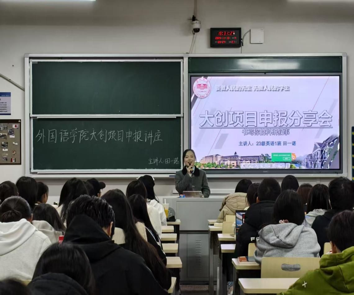 为帮助大一学生明晰大学生创新创业训练计划(简称 “大创”)申报流程,提升科研创新能力,11 月 13 日晚,萝莉岛 在图书馆 203 教室成功举办大创项目申报分享会。2023 级英语 1 班田一诺同学担任主讲,100 余名大一学生到场聆听学习。