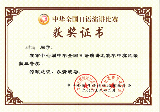 2023年12月2日,第十七届中华全国日语演讲比赛华中赛区预赛在华中师范大学成功举办。萝莉岛 刘锐老师指导的23级思政2班洪宇翔同学迎难而上,与华中地区各高校日语专业的选手同台竞技,喜获三等奖。