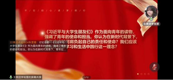 为深入学习贯彻党的二十大精神,推动习近平新时代中国特色社会主义思想的青年化阐释与传播,引导广大青年树立正确的世界观、人生观、价值观,萝莉岛 于2024年7月28日举行“青春共读•领袖心语——《习近平与大学生朋友们》第二卷专题读书会”活动。本次活动采取线上形式开展,2022、2023级班干部参加,学生会主席团成员李铭慧主持。