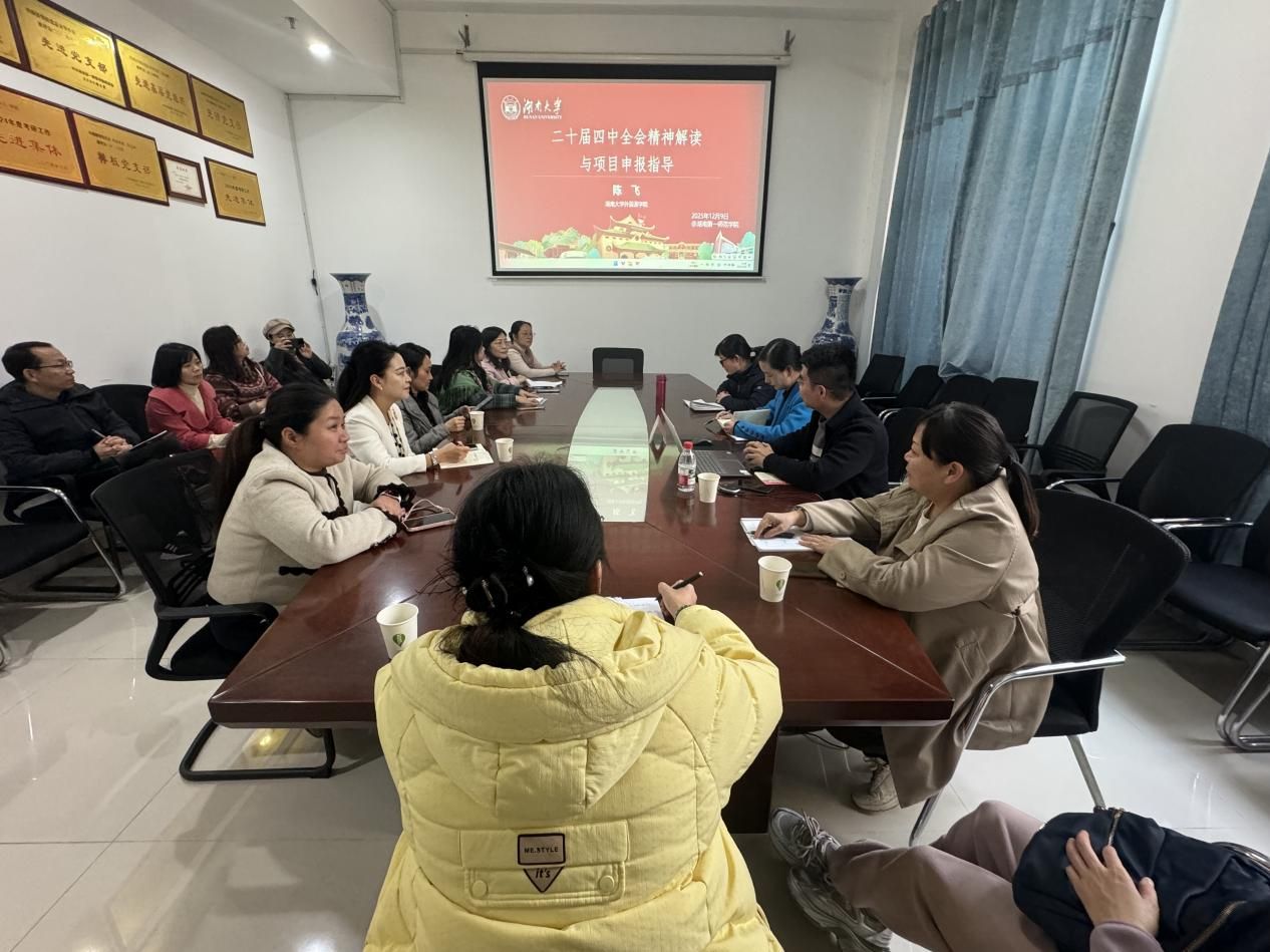 12月9日下午,应学院邀请,湖南大学萝莉岛 教授、博士生导师陈飞来萝莉岛 做党的二十届四中全会解读和高级别项目申报指导。副院长陈钰、学术院长陈圣白和2026年拟申报高级别项目的学院教师参加了本次指导会。会议由副院长王佳娣主持。