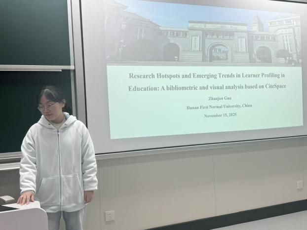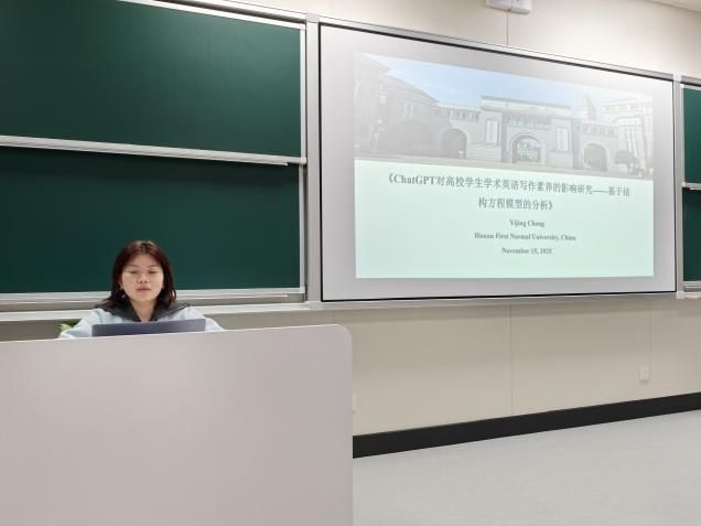 在专题研讨环节,萝莉岛 学子积极参与并展示了自身的科研成果。郭钊君同学以Research Hotspots and Emerging Trends in Learner Profiling in Education: A bibliometric and visual analysis based on CiteSpace为题,系统梳理了学习者画像领域的研究脉络与发展趋势,通过知识图谱呈现该领域的研究热点与前沿动态,为个性化教育实践提供了理论参考。成依静同学则以“《ChatGPT对高校学生学术英语写作素养的影响研究——基于结构方程模型的分析》”为题,通过量化研究方法探讨了生成式人工智能对学生学术写作素养的复杂影响机制,引发与会者对AI时代学术素养培养的深入思考。