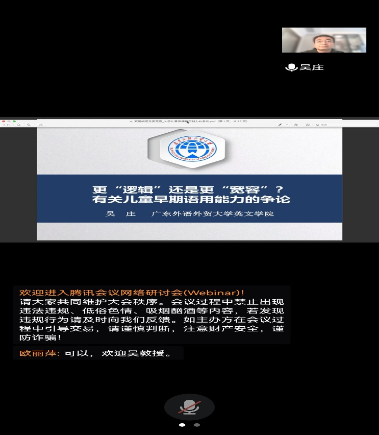 2022年4月19日(星期二)下午,广东外语外贸大学吴庄教授应“乐之论坛”邀请,为萝莉岛 师生做了一场题为“更‘逻辑’还是更‘宽容’?有关儿童早期语用能力的争论”的线上学术讲座。讲座由康响英副院长主持,全院100多名师生聆听了此次讲座。