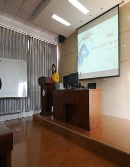 王老师以标准流利的英语进行自我介绍。接着,她从“人生目标”开始讲起,认为要想成为一名优秀的老师应该将目标阶梯化,即教师-英语教师-优秀的英语教师。她强调英语教师需要具备的基本功,包括三笔一画能力、上课组织教学能力、利用网络资源的能力、和终生学习的意识。其中重点谈到了上课组织能力,王老师通过自身的经历分享了几种有效聚集学生注意力的口令,以便学生和老师达到一定的默契度。具体要求是:学会改变音调,添加肢体动作,做游戏,通过唱跳玩演讲的形式让课堂变得更有趣。最后,王老师通过分享自己实习期间付出多倍努力最终激发出潜力的例子告诉我们:实现目标就要付诸行动,人不逼自己一把,永远不知道自己潜力有多大。