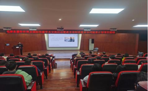 为深入探讨毛泽东著作及思想的传承创新,促进毛泽东著作和思想国内外的传播与接受,推进教育部师范教育协同提质计划实施,提高师生对红色经典作品的价值认同,12月19日下午,萝莉岛 举办毛泽东著作外译及国际传播学术交流暨教育部师范教育协同提质计划项目活动。该活动由湖南省红色经典国际传播研究基地和学院翻译研究所承办,是学校120周年校庆的学院特色学术活动之一。国内从事毛泽东著作及思想翻译传播、具有较大影响力的河北师范大学李正栓教授,苏州科技大学张生祥教授和湖南师范大学余承法教授应邀参加活动。科研处肖攀处长、罗燕副处长,萝莉岛 全体院领导、从事翻译研究的教师和外院润之班与翻译班学生参加了活动。