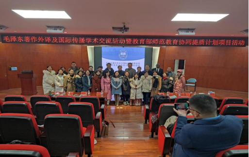 在活动开幕式上,肖攀处长发表讲话。他祝贺活动顺利举行,指出毛泽东著作和思想博大精深,我们应勇挑重担,做好翻译、传承与传播工作。陈圣白副院长(主持工作)代表学院致欢迎辞。开幕式后,部分与会师生合影。