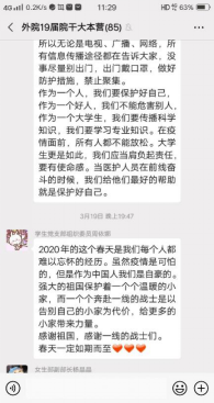84岁高龄的钟南山院士、抗疫志愿者郑能量等一批批最美逆行者激发了一大批青年学生党员投身抗疫一线的热情和斗志,萝莉岛 学生党员杨苗、曾文湘等同学主动参与当地集中隔离酒店的消毒活动,帮助登记排查出入村庄的群众,配合团县委办公室在公众号上推送疫情信息、防疫知识和优秀青年志愿者典型事迹;体育学院学生党员汪宇雨等同学利用自己特长协助村干部编辑疫情防控事项、手绘标语,走村串户为向村民宣传疫情防控知识,帮助村民填写外出务工表、注册疫情防控健康卡,用实际行动践行着共产党员的初心使命。
