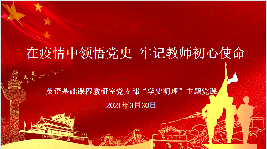 2021年3月30日下午,英语基础课程教研室党支部通过腾讯会议的形式进行,开展“学史明理”专题学习研讨,支部全体党员参加学习。