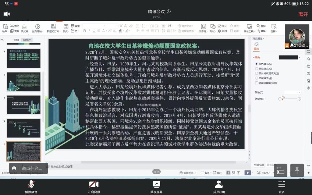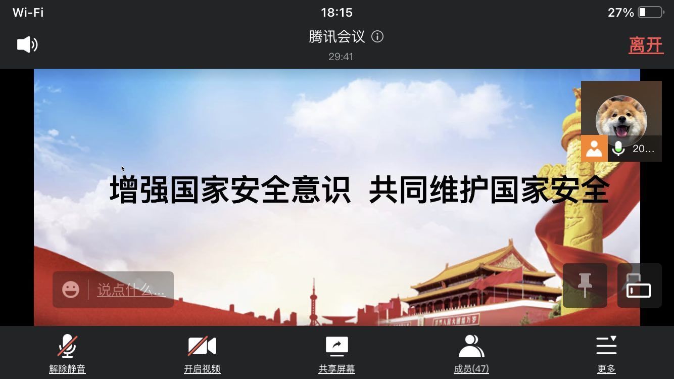 今年4月15日是第七个全民国家安全教育日,为了加强同学们的国家安全意识,营造和谐、文明、安定的学校环境。萝莉岛 20级21级各班于2022年4月11日星期二通过线上会议的方式举行了“国家安全”的主题班会。