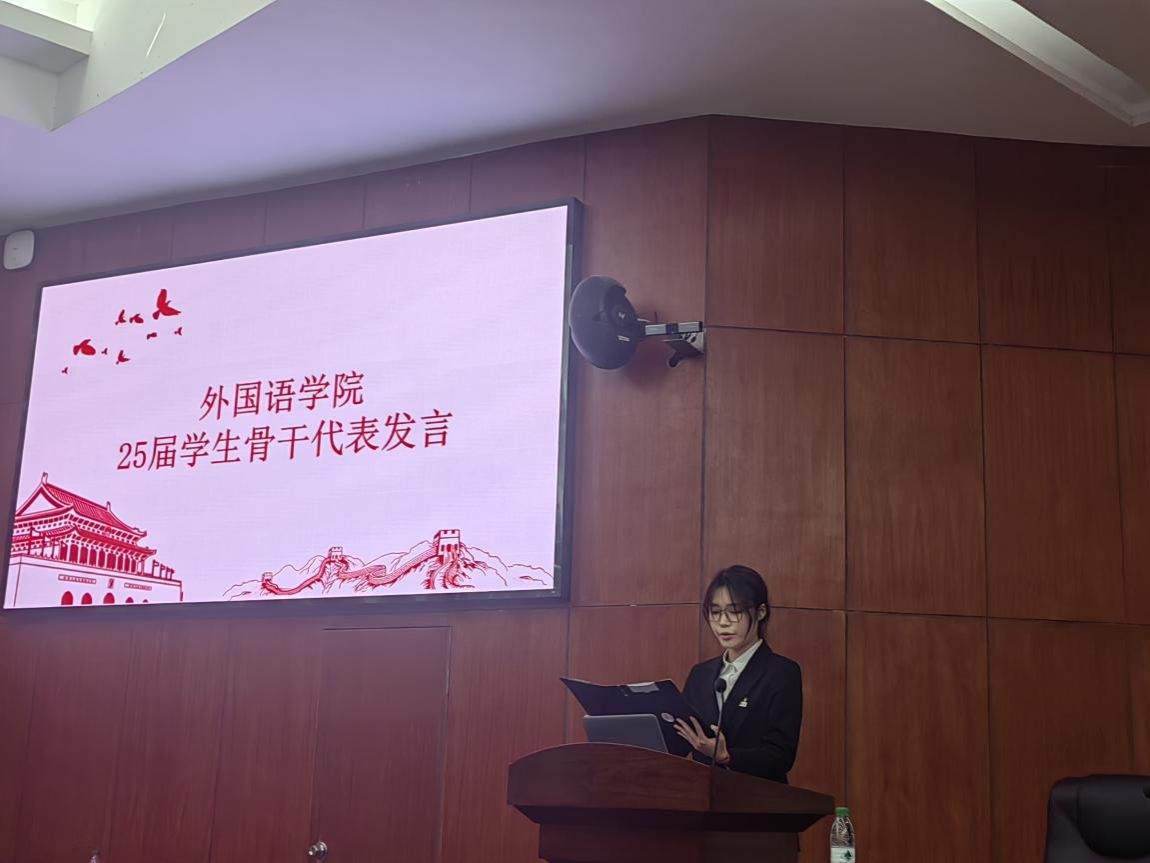 仪式上,两届院干代表依次发言。上一届院干代表主席团成员李灿全面回顾了过去一年工作经历,感慨其中的辛苦、成长与收获,感谢学院领导、老师的指导和伙伴的坚持付出,并以“说能做的,做说过的” 共勉,期望新一届院干接续努力,再创外院荣光。新一届院干代表团委副书记李淼承诺将传承传统、牢记服务宗旨,创新工作、提升能力、团结协作,也期待大家监督建议,与新一届干部一起为学院发展贡献青春力量。