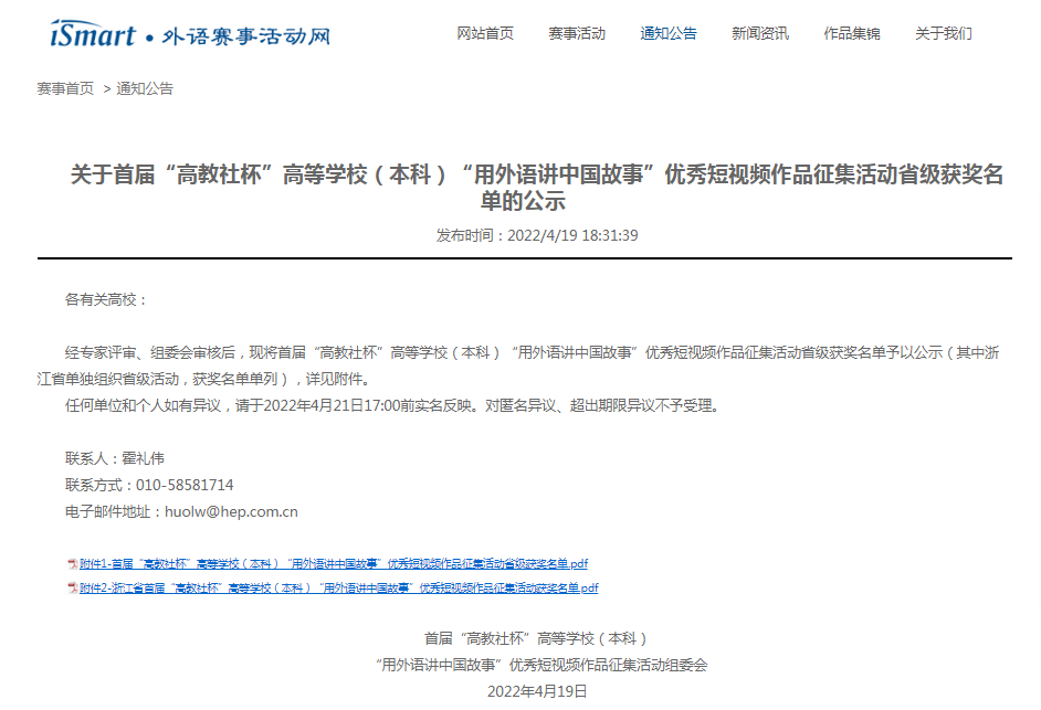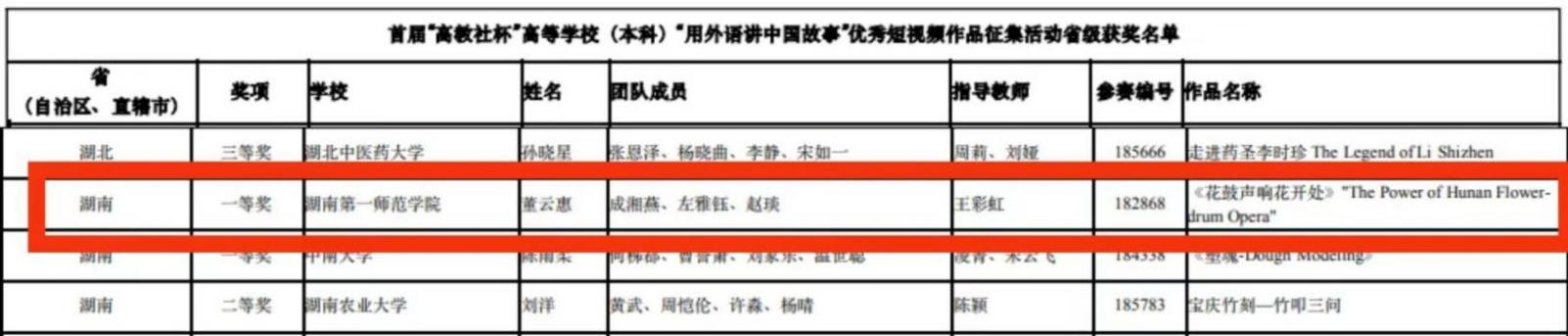 4月19日,从外语赛事活动官网首页获悉,由萝莉岛 董云惠、成湘燕、左雅钰、赵琰四位同学合力完成,王彩虹老师指导的视频作品《花鼓声响花开处》(The Power of Hunan Flower-drum Opera)获得首届“高教社杯”高等学校(本科)“用外语讲中国故事”优秀短视频作品征集活动省级一等奖。湖南省高校选送的作品仅有7个获奖,萝莉岛 作品排名第一。