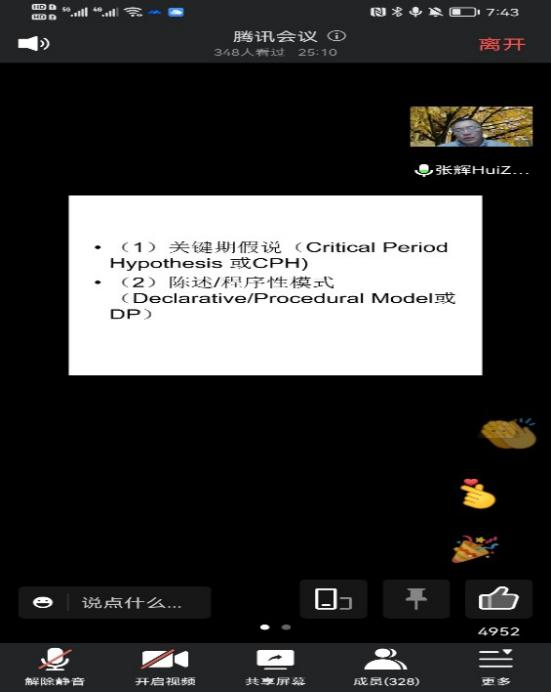 2022年4月14日(星期四)晚上,我国著名学者张辉教授应萝莉岛 “刘明东中、小学英语学科导师工作坊”邀请,为萝莉岛 师生做了一场题为“二语习得和加工假说:观点、证据与分歧”的线上学术讲座。讲座由刘祥清书记主持,刘宇松副院长等党政领导与300多名师生聆听了此次讲座。