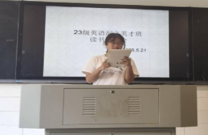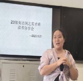 2025年5月21日下午,23级英语润之英才班“文学的魅力与探索”读书分享会在怀中北110教室隆重举行。活动以经典与当代文学的跨时空对话为核心,吸引了班级全体同学参加。学院何培森书记、胡靓博士、罗海燕老师参加并做指导,现场气氛热烈,书香弥漫。