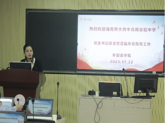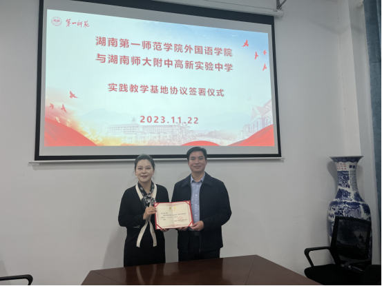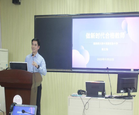 2023年11月22日下午,应萝莉岛 邀请,湖南师大附中高新实验中学党委书记陈文锋在怀中北602做题为"做新时代合格教师"的专题讲座。讲座之前,双方举行了实践教学基地协议签署仪式,萝莉岛 陈圣白副院长(主持工作)给陈文锋书记颁发了校外实践导师聘书。出席本次仪式的还有湖南师大附中高新实验中学罗秀琴主任、院党委书记刘祥清、教科办主任廖爱秀、学工办主任刘洁、辅导员陈蓓。22级英语卓越班、23级英语“润之英才”班全体同学参加了讲座。讲座由陈圣白主持。