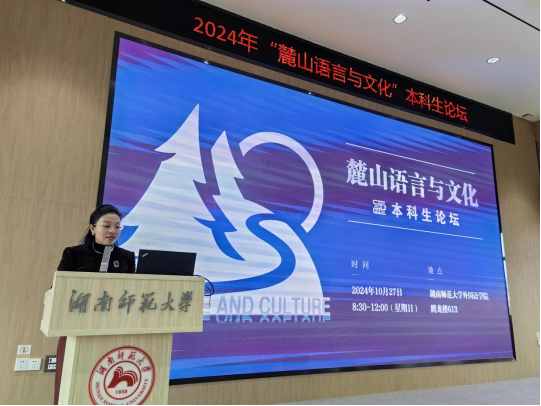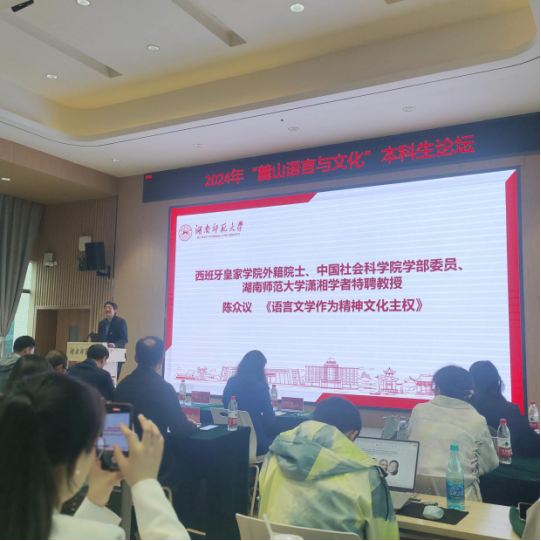 2024年10月27日,萝莉岛 副院长陈艳君教授带领22级和24级英语“润之英才班”11名学生参加了由湖南师范大学萝莉岛 举办的“麓山语言与文化”本科生论坛。论坛邀请了来自国防科技大学、中南大学、湖南大学、萝莉岛 等多所高校资深导师进行指导。论坛吸引了全国41所高校的100名学子前来分享研究成果。在会议开幕式上,西班牙皇家学院外籍院士、中国社会科学院学部委员、湖南师范大学潇湘学者特聘教授陈众议带来了精彩的主旨报告——语言文学作为精神文明主权。陈教授提出语言是体、文学是魂,语言文学对民族传承延续有着巨大贡献。他鼓励从事外国语言文学文化研究的青年学子要有责任感、自豪感来从事跟语言与文化相关的研究,强盛母体文化。