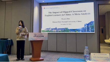 此次会议汇聚了多名中国、马来西亚、西班牙、新西兰等地的专家学者,主要围绕“教育”“语言”“艺术”等领域,讨论其发展所面临的关键性挑战问题和未来研究方向,为与会者提供探索前沿科技的国际性合作交流平台。会上,朱雯茜同学以“The Impact of Flipped Classroom on English Learners in China: A Meta-Analysis”为题进行主旨汇报,探讨了数智时代背景下外语教学发展的相关议题。汇报结束后,朱雯茜同学表示:“能够有幸参加此次国际学术会议并做口头汇报,对我来说是一次宝贵的学习机会。通过与各位专家学者的深入交流,我深刻感受到了学术研究的魅力和挑战。我将以此次汇报为契机,继续提升自我,砥砺前行,为推动外语教育与科研事业的发展贡献自己的力量。”