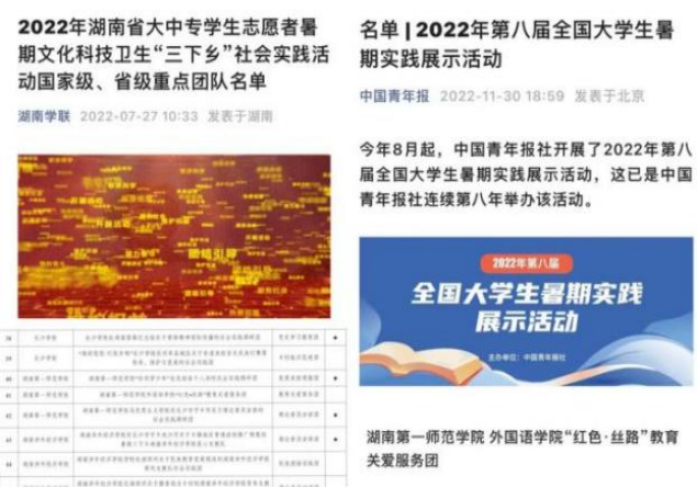 学院“青茧”和“金穗”三下乡支教团队走访湘潭市湘潭县乌石镇和益阳市安化县大福镇,开展红色文化主题调研和支教活动,受到了共青团中央、湖南省委宣传部、湖南省教育厅、共青团湖南省委等部门的一致认可,荣获“全国百强团队”、“全国优秀实践项目”等国家级、省级奖项30余次。