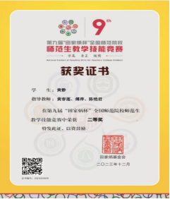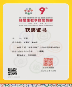 2023年,黄静、厉琴同学获“田家炳杯”第九届全国师范院校师范生教学技能竞赛全国二等奖。