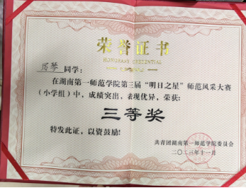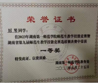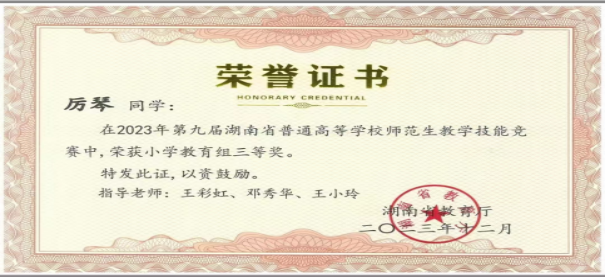 厉琴获湖南省第九届普通高等学校师范生教学技能竞赛小学教育组三等奖、萝莉岛 第九届师范生教学技能竞赛一等奖及第三届“明日之星”师范生技能比赛三等奖。