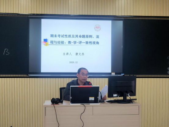唐文杰做了题为《期末考试性质及其命题原则、流程与经验:教-学-评一致性视角》的讲座。讲座分三部分内容:
